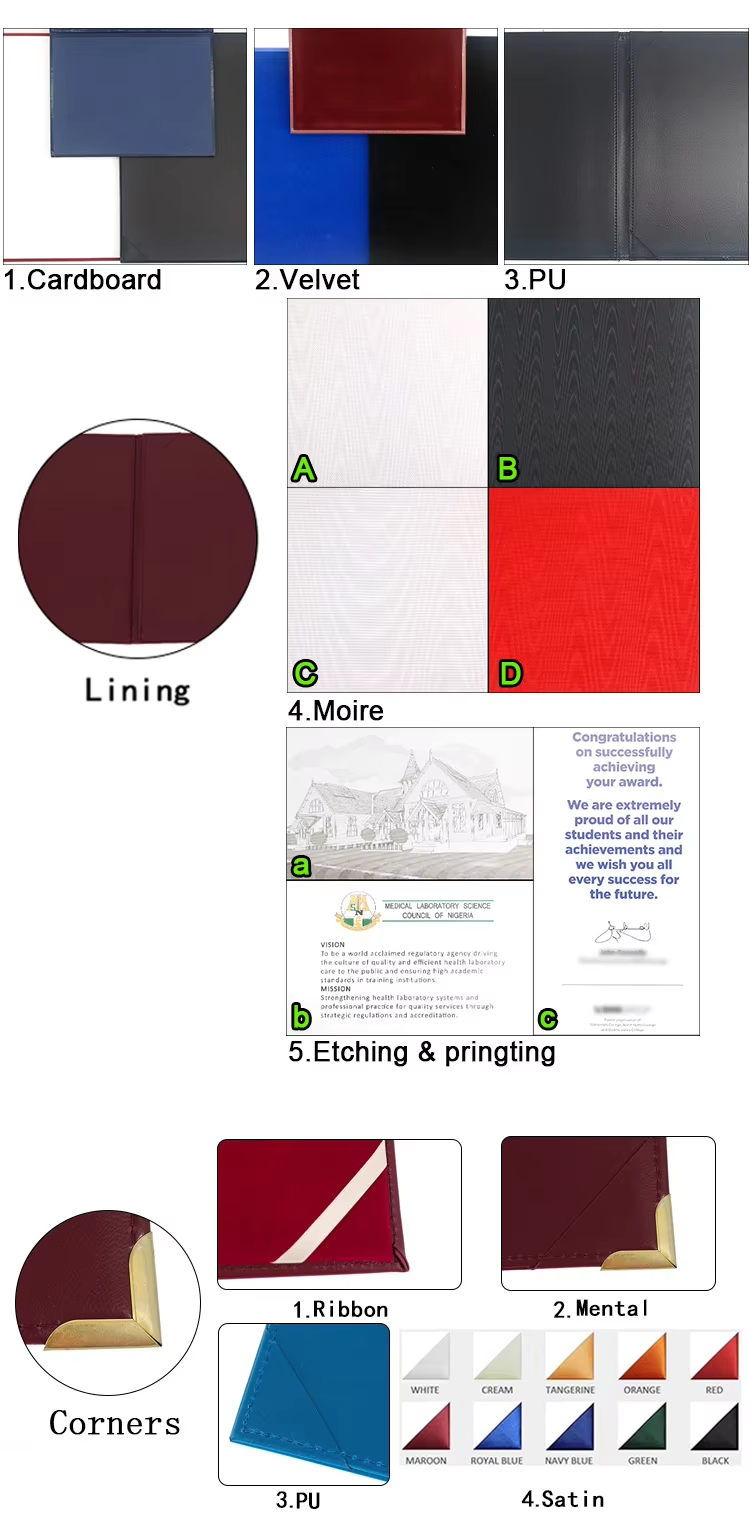 ● Mukauttamisvaihtoehdot:Varmenteiden haltijamme tukee täydellistä mukauttamista, mukaan lukien painetut logot, kohokuvioidut kuviot ja räätälöidyt sisäiset asettelut yhden tai useamman sertifikaatin sovittamiseksi. Voit valita joukosta värejä, materiaaleja ja viimeistelyjä, jotka vastaavat tuotemerkki -identiteettiäsi. Tarjoamme myös koon säätöjä varmistaaksemme täydellisen yhteensopivuuden asiakirjan mittojen kanssa.